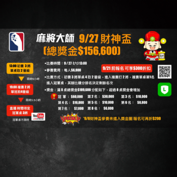 🀄️ 報名完成後將為您保留席次。每桌滿 4 人即開賽,若人數不足未能成功湊桌,主辦單位將提前通知,已繳之參賽費用可保留至其他等值賽事使用。